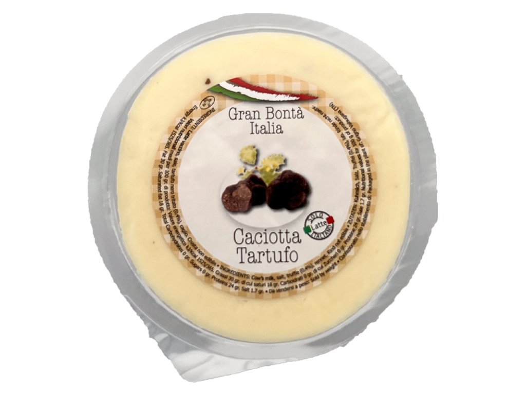 Caciotta Tartufo, poloměkký kravský sýr s lanýžem, 150 g je exkluzivní specialita z italské sýrárny Monti Trentini, vyrobená z prvotřídního kravského mléka a obohacená o kousky černého letního lanýže.