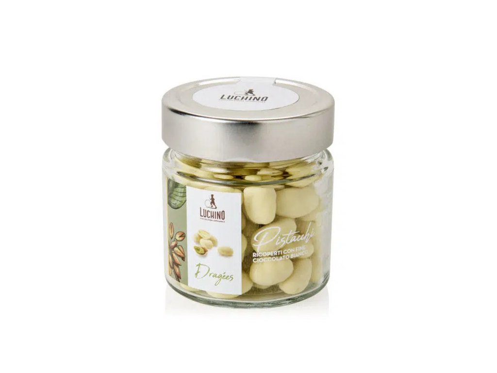 Luchino, Dragées – Sicilské pistácie v bílé čokoládě, 110 g (sklo)