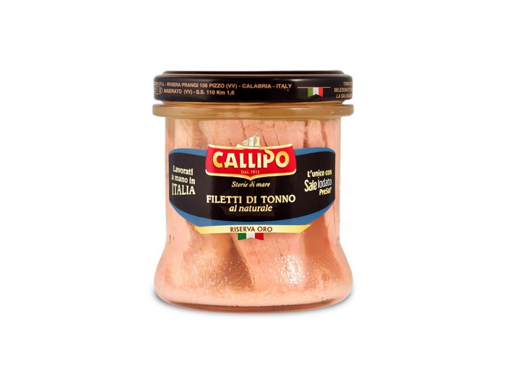Prémiové filety z tuňáka Callipo Riserva Oro, zpracované výhradně v Kalábrii tradiční metodou, díky které si zachovávají svou jemnou chuť i kompaktní strukturu. Tuňák je naložen pouze ve vlastní šťávě, což zvýrazňuje jeho přirozenou chuť a nízký obsah tuku.