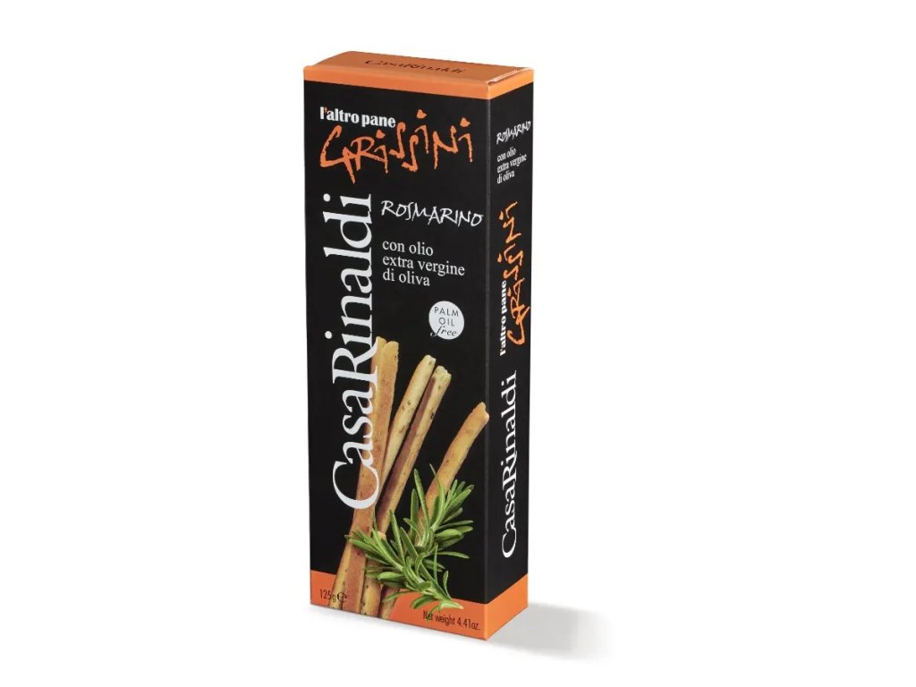 Grissini Breadstick Rosmarino, 125g Grissini al Rosmarino od Casa Rinaldi jsou jemné, křupavé tyčinky pečené s rozmarýnem, který jim dodává výraznou a svěží chuť. Extra panenský olivový olej jim propůjčuje jemnou, příjemně olejovou texturu, zatímco aromatický rozmarýn přináší charakteristickou bylinkovou vůni a chuť Středomoří.