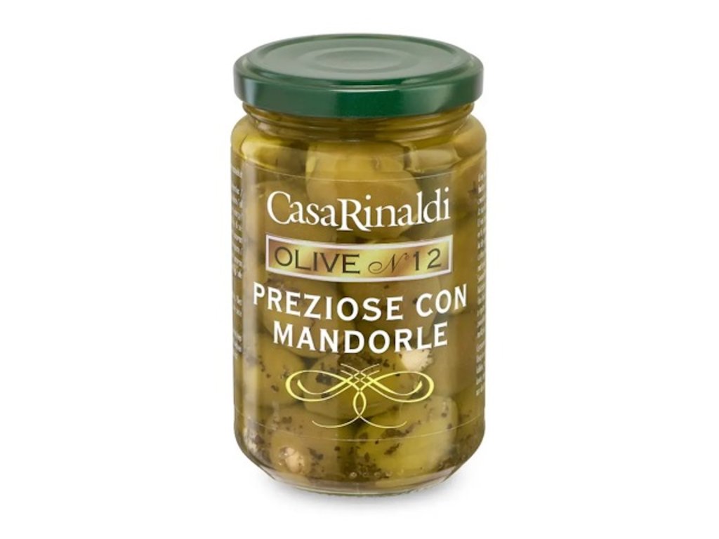 Olivy plněné mandlemi, 290 g – Casa Rinaldi jsou lahodné zelené olivy nejvyšší kvality, plněné celými jemně křupavými mandlemi. Tato neobvyklá a sofistikovaná kombinace chutí potěší každého milovníka delikates.