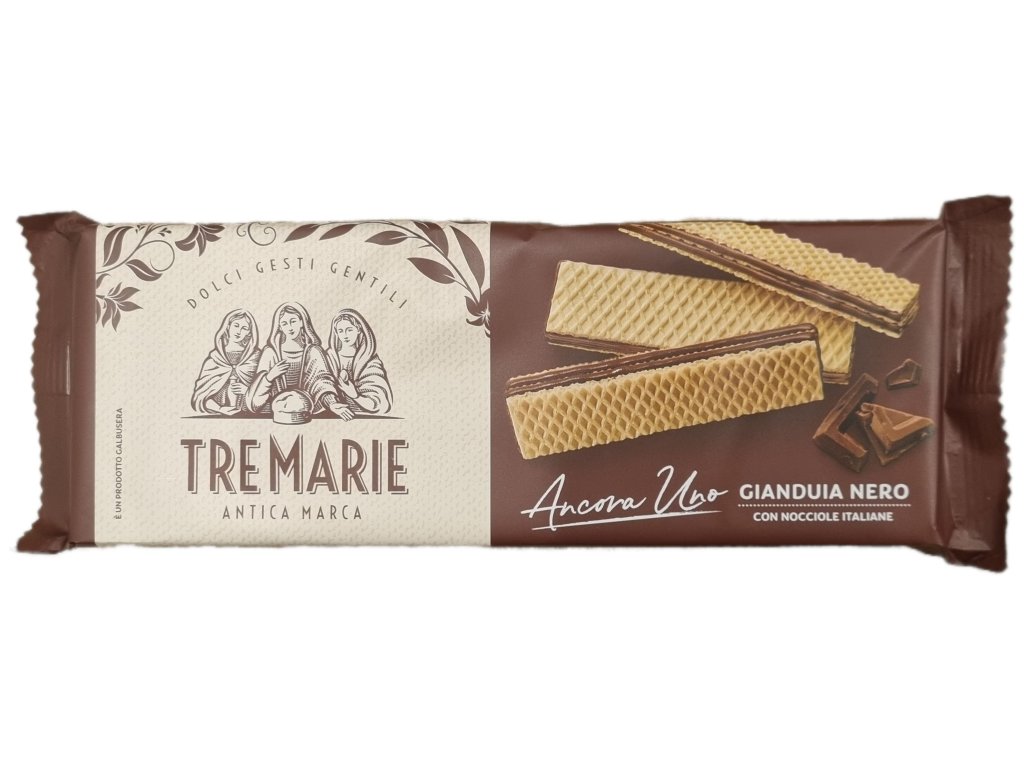 Wafer Ancora Uno Gianduia Nero od značky Tre Marie jsou lahodné oplatky plněné intenzivní krémovou náplní s příchutí tmavé čokolády Gianduia. Tato pochoutka spojuje jemné, křehké oplatky s bohatou, výraznou chutí čokolády Gianduia.