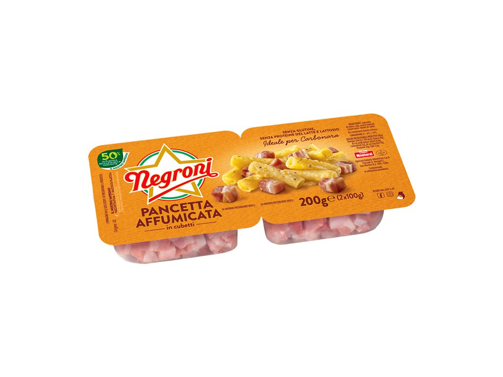 Pancetta affumicata je tradiční italská uzenina vyráběná z vepřového bůčku, který se solí, koření a následně šetrně udí, aby získal svou charakteristickou chuť a aroma. Negroni nabízí tuto delikatesu již nakrájenou na malé kostičky, díky čemuž je připravená k okamžitému použití v kuchyni.
