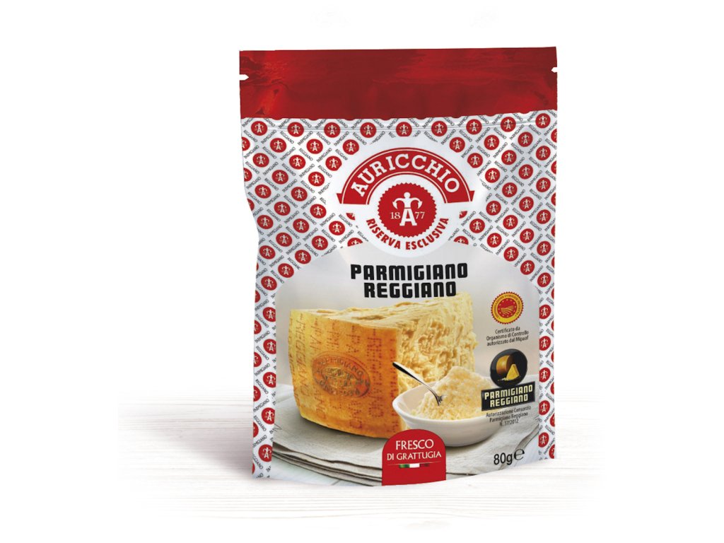 Strouhané Parmigiano Reggiano v 80g balení je vhodné pro přímé použití do těstovin nebo risotta.