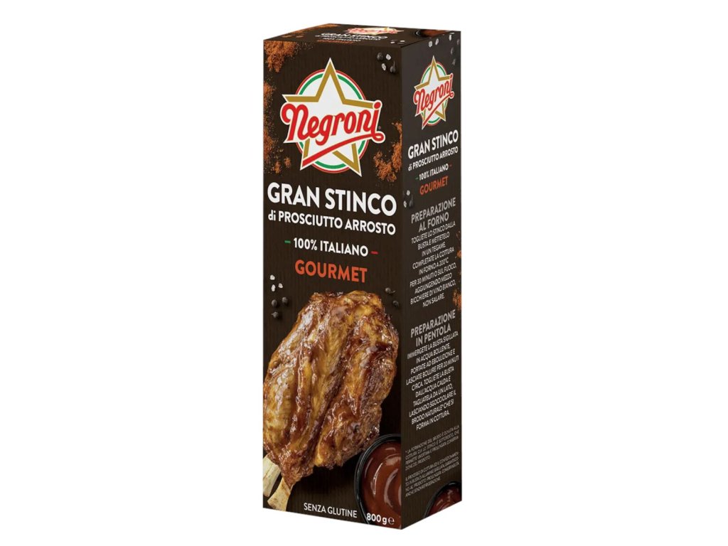 Gran Stinco di Prosciutto Arrosto od značky Negroni je vepřové koleno z prvotřídního vepřového masa, je pomalu pečené, aby vynikla jeho přirozená chuť. Pomalé pečení vytváří jemnou a šťavnatou strukturu se zlatohnědou kůrkou, která dodává pokrmu bohatost a skvělou chuť. Koleno je předvařené, což jej činí velmi snadné na přípravu – stačí jej ohřát a servírovat. Můžete podávat jako hlavní chod, nebo zařadit na talíř s uzeninami.