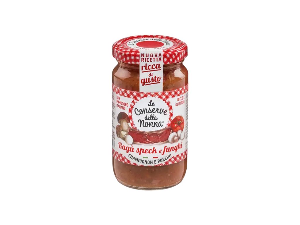 Tato rustikální omáčka z horské kuchyně kombinuje uzený špek, žampiony a hříbky, čímž vytváří výraznou a vyváženou chuť. Rajčatový základ doplněný o kvalitní ingredience dává ragù hutnost a autentický charakter, který připomíná tradiční domácí recepty z italských hor.